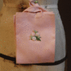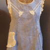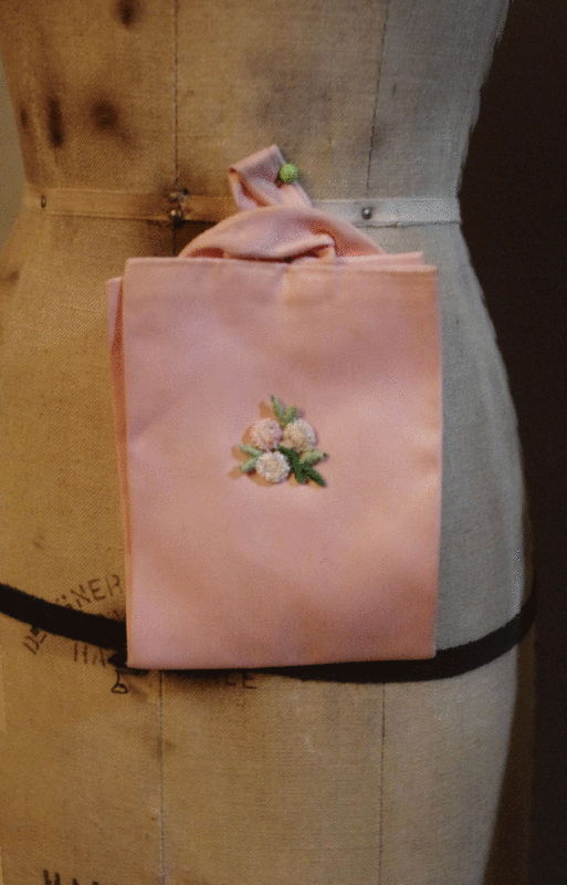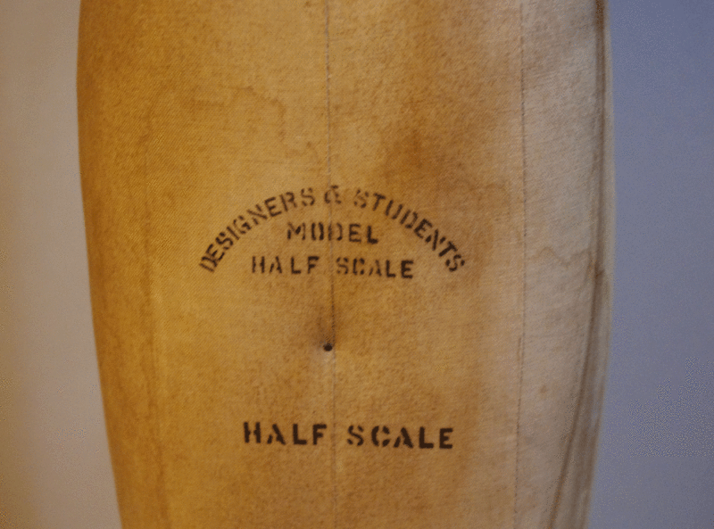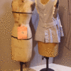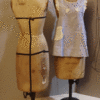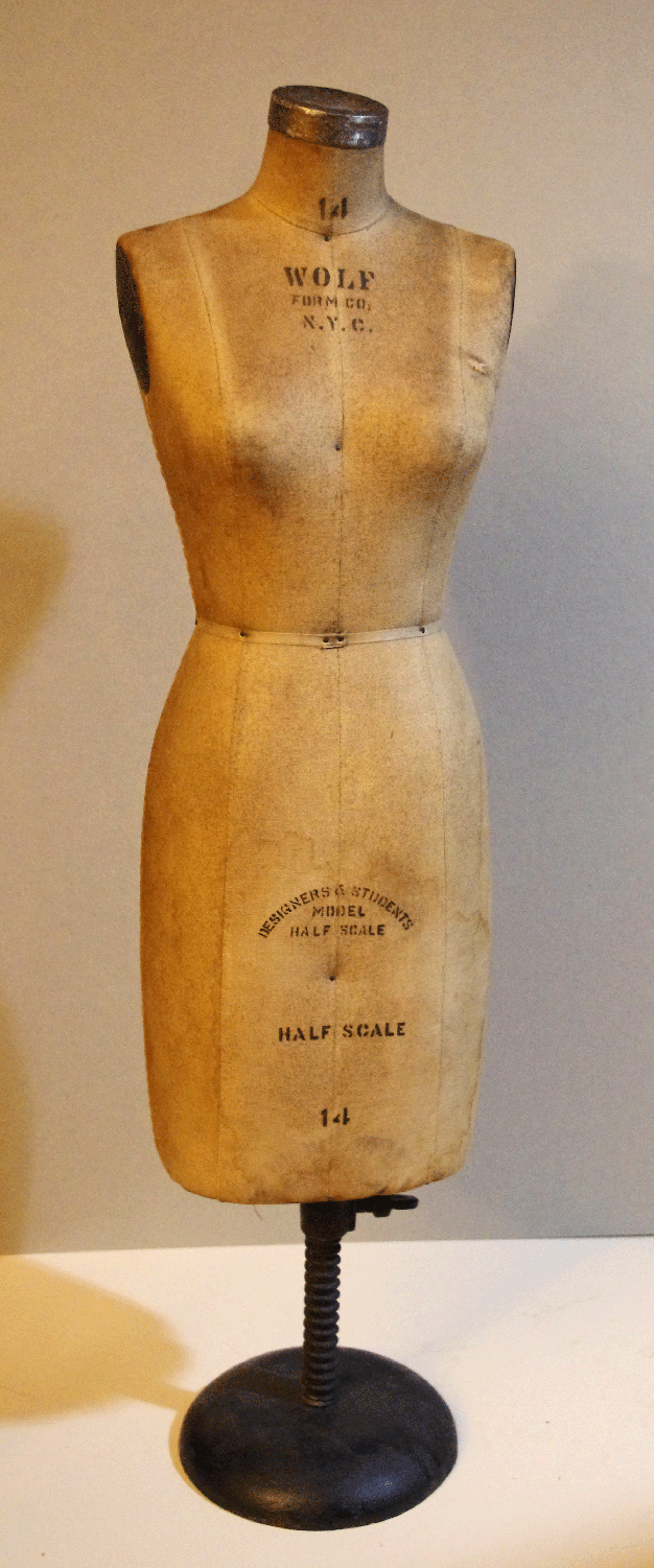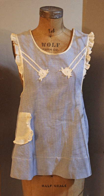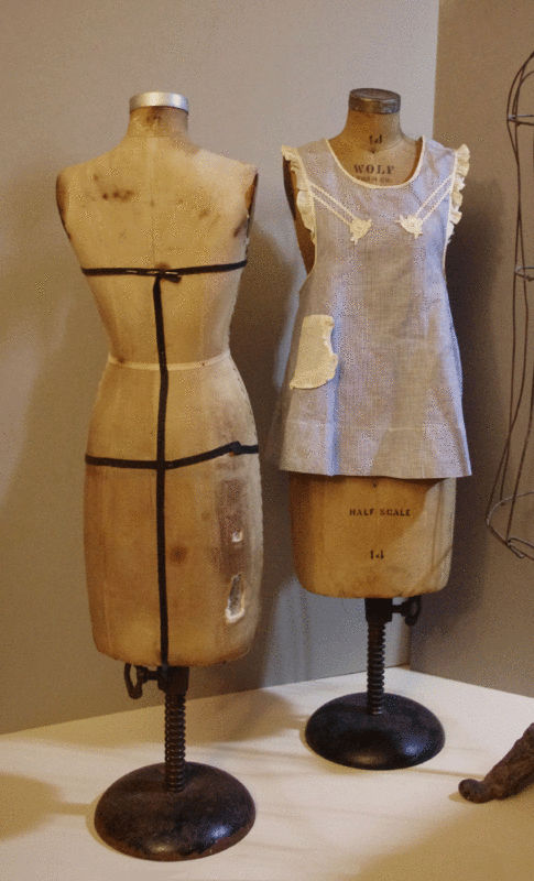Two half-scale Wolf model forms, sizes 12 and 14, shown with a turn-of-century wire counter-top display. The sz.12 (left) has an embroidered pink silk purse pinned at the waist; the sz. 14 (right) has a blue-and-white check apron, perfectly scaled from the width of the ruffles to the size of the checks; probably either design class projects or a teacher's demo pieces.