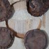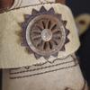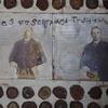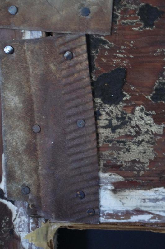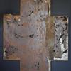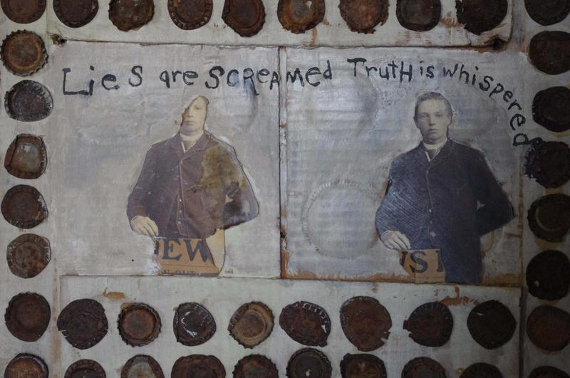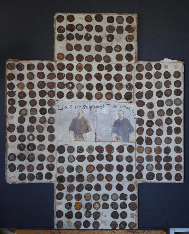 "Lies are screamed Truth is whispered" is handwritten above twin antique photos at the center of this outsider art collage. Remnants of print (newsprint?) show below the photos, which are framed by a field of rusty bottle caps. The substrate is plywood faced with cardboard and painted white. One cross-arm is attached with found metal pieces. It is hard to date a piece assembled from found objects, but based on materials and condition we would guess mid-20th C.