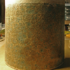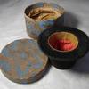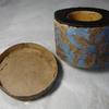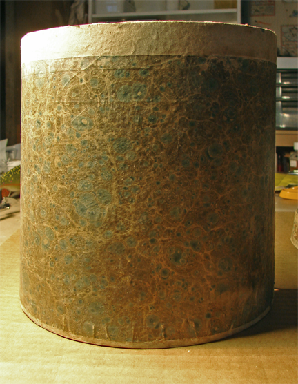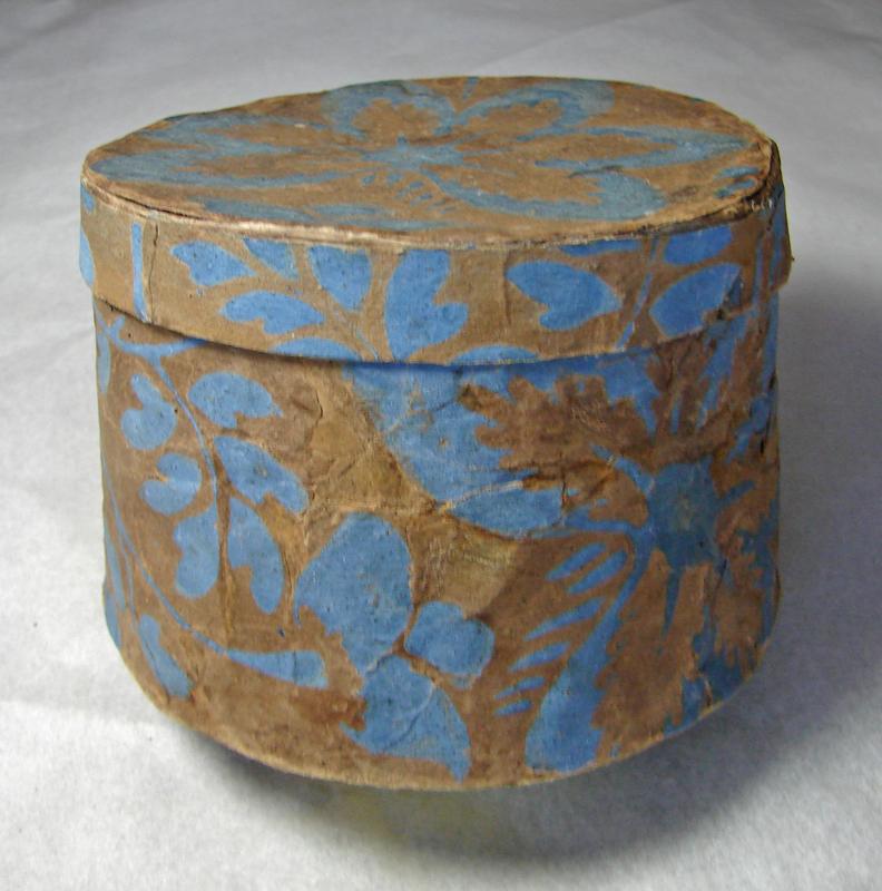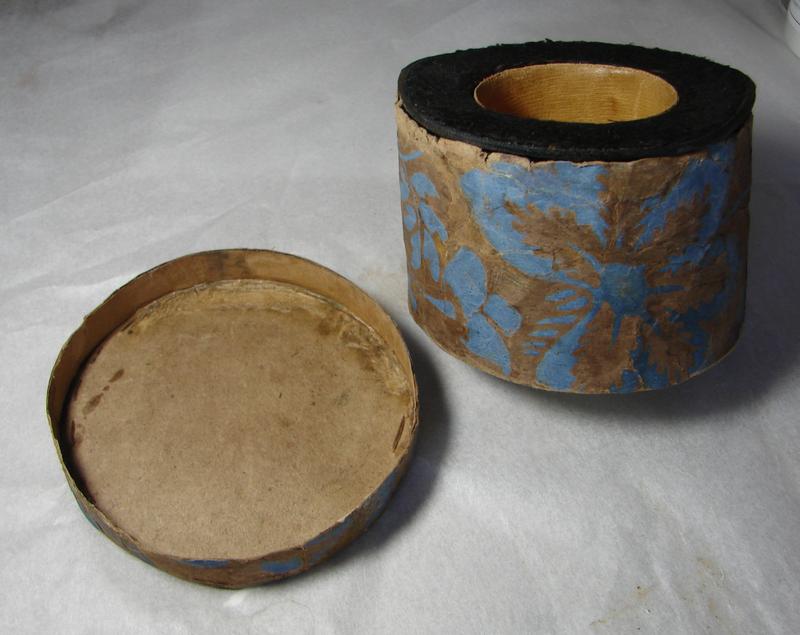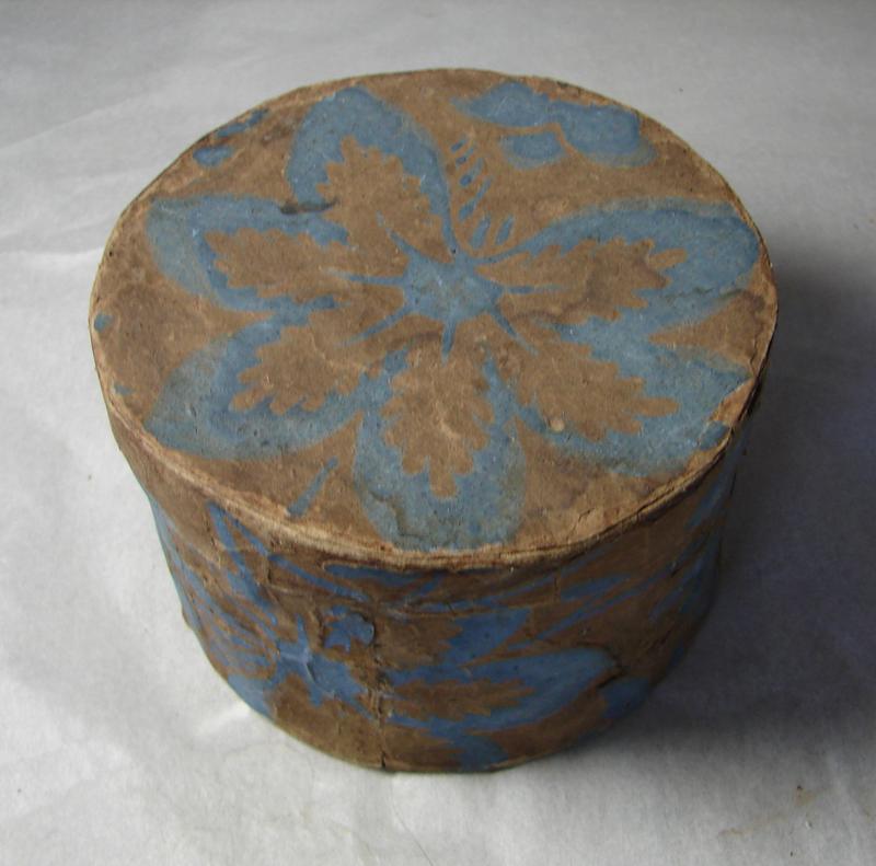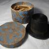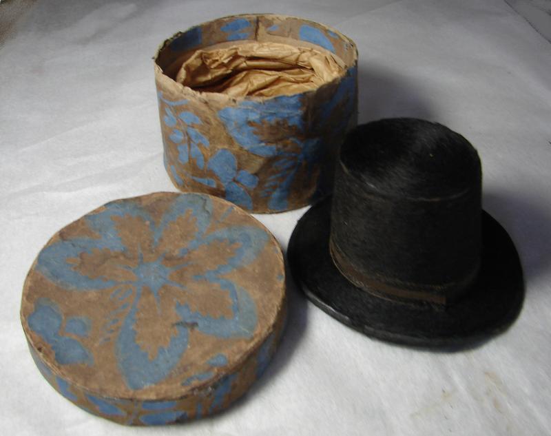 Journeyman's Sample: A perfectly-proportioned miniature beaver top hat, ca. 1845, with wallpaper-covered hat box. The box measures about 5" in diameter.