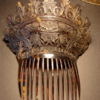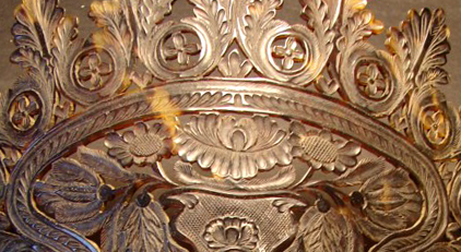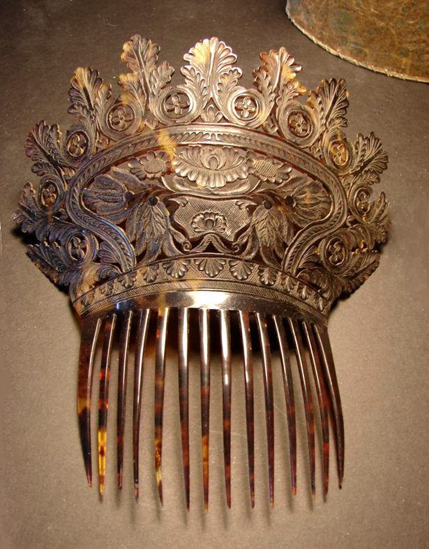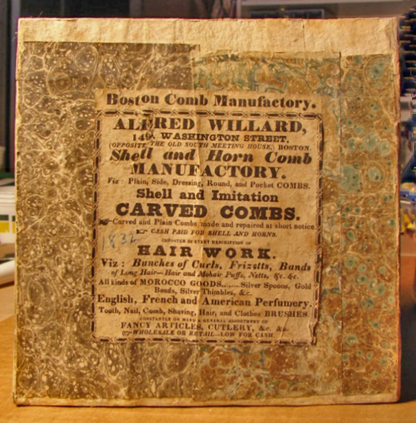 Beautiful horn or tortoiseshell comb, ca. 1830; its shaped box (abt. 12" high) is covered in marbled paper and has a wonderful intact label identifying the Boston maker, Alfred Willard, who offered "shell and horn combs" and "hair work," among other things. The detail view shows the beautiful carving on the comb. Slight damage to box lid and minor hornworm damage to comb teeth. Another masterfully-crafted piece.