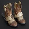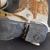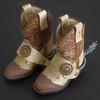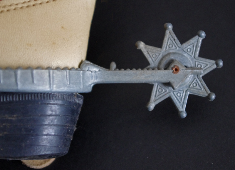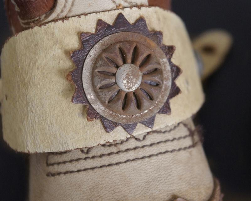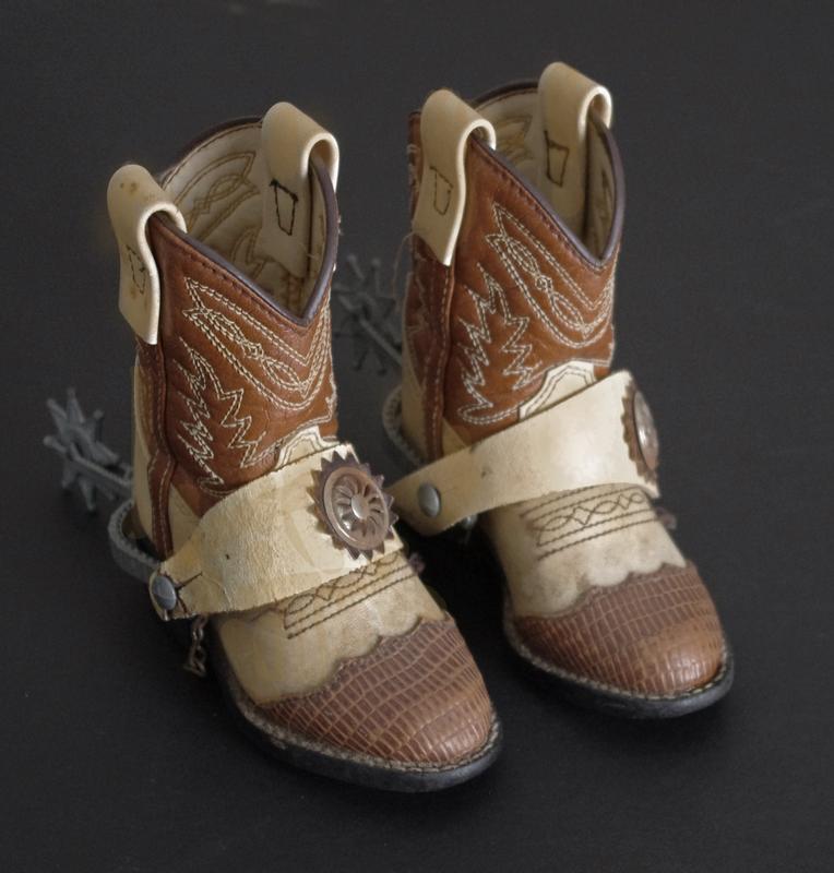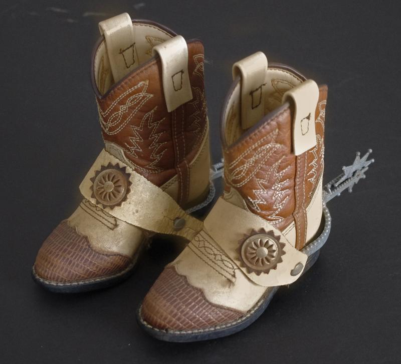 Child's cowboy boots in tan and cream leather; spurs are aluminum or pot metal with tin conchos on their straps. Worn gently but (we're sure) proudly. End of spur strap (right boot) reinforced with leather patch on back. Mid-20th century.